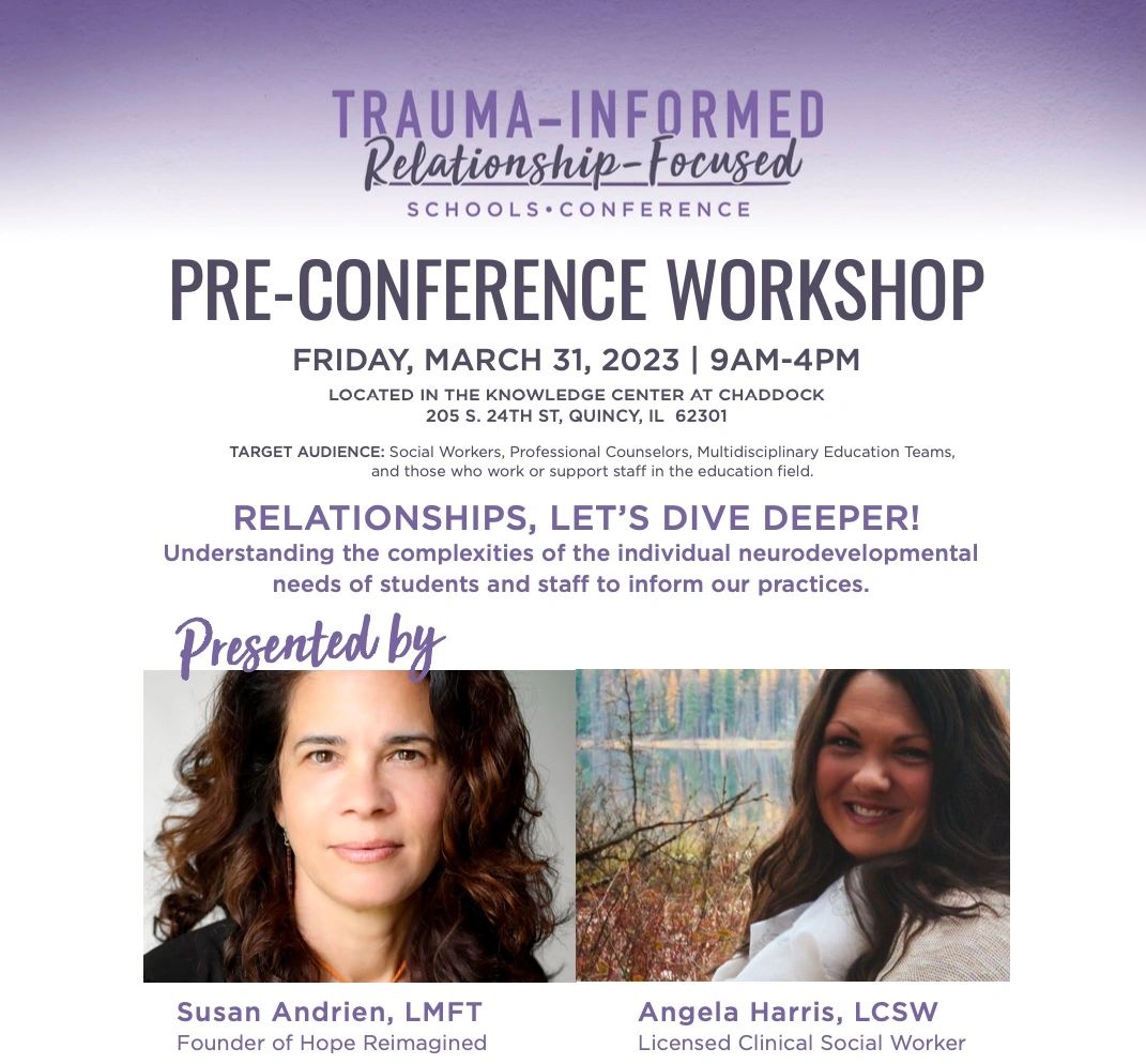 Susan Andrien LMFT, Founder of Hope Reimagined & Angela Harris LCSW, will be leading a Pre-Conference session and presenting at the 2nd annual Trauma Informed Relationships In Schools Conference March 31-April 1st.